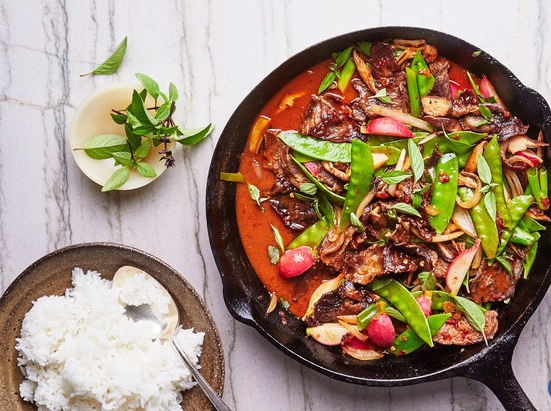 - Add radishes, snow peas, and broth and bring to a boil. Cook until liquid is reduced by half and meat and vegetables are glossy and saucy, about 5 minutes. Season with salt and pepper. Serve stir-fry over rice topped with basil.